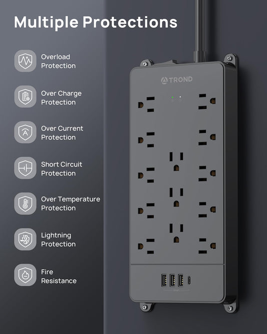 TROND Surge Protector Power Strip, 4000 Joules, ETL Listed, 13 Widely-Spaced Outlets Expansion with USB C Ports, Low-Profile Flat Plug, Wall Mountable, 5ft Extension Cord, 14AWG Heavy Duty, Black
